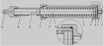 1.進油口;2.后蓋鎖母;3.活塞;4.O形環(huán);5.彈簧;6.推桿;7.連接螺母;8.密封劑充填口;9.劑料腔;10.出料口;11.槍體