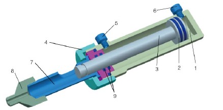 1.液壓缸;2.活塞;3.推桿;4.槍體與液壓缸連接鎖母;5.液壓油接頭;6.液壓油接頭;7.劑料腔;8.槍頭;9.導(dǎo)向環(huán)